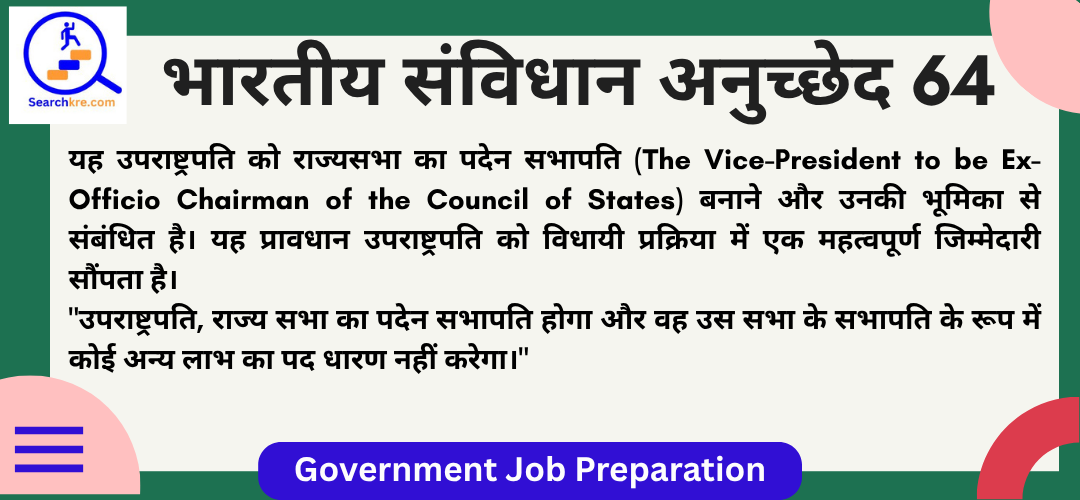 अनुच्छेद 64 भारतीय संविधान के भाग V (संघ) के अंतर्गत अध्याय I (कार्यपालिका) में आता है। यह उपराष्ट्रपति को राज्यसभा का पदेन सभापति (The Vice-President to be Ex-Officio Chairman of the Council of States) बनाने और उनकी भूमिका से संबंधित है। यह प्रावधान उपराष्ट्रपति को विधायी प्रक्रिया में एक महत्वपूर्ण जिम्मेदारी सौंपता है।