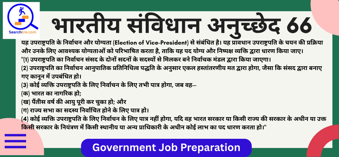 अनुच्छेद 66 भारतीय संविधान के भाग V (संघ) के अंतर्गत अध्याय I (कार्यपालिका) में आता है। यह उपराष्ट्रपति के निर्वाचन और योग्यता (Election of Vice-President) से संबंधित है। यह प्रावधान उपराष्ट्रपति के चयन की प्रक्रिया और उनके लिए आवश्यक योग्यताओं को परिभाषित करता है, ताकि यह पद योग्य और निष्पक्ष व्यक्ति द्वारा धारण किया जाए।