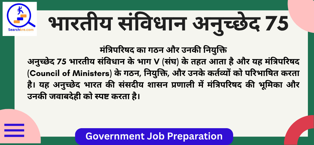 अनुच्छेद 75 भारतीय संविधान के भाग V (संघ) के तहत आता है और यह मंत्रिपरिषद (Council of Ministers) के गठन, नियुक्ति, और उनके कर्तव्यों को परिभाषित करता है। यह अनुच्छेद भारत की संसदीय शासन प्रणाली में मंत्रिपरिषद की भूमिका और उनकी जवाबदेही को स्पष्ट करता है।