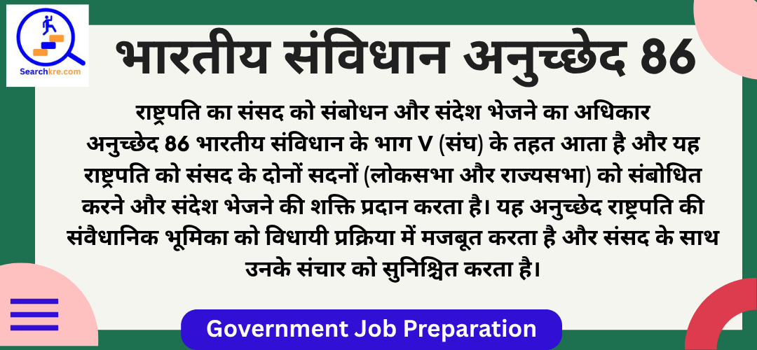 राष्ट्रपति का संसद को संबोधन और संदेश भेजने का अधिकार अनुच्छेद 86 भारतीय संविधान के भाग V (संघ) के तहत आता है और यह राष्ट्रपति को संसद के दोनों सदनों (लोकसभा और राज्यसभा) को संबोधित करने और संदेश भेजने की शक्ति प्रदान करता है। यह अनुच्छेद राष्ट्रपति की संवैधानिक भूमिका को विधायी प्रक्रिया में मजबूत करता है और संसद के साथ उनके संचार को सुनिश्चित करता है।