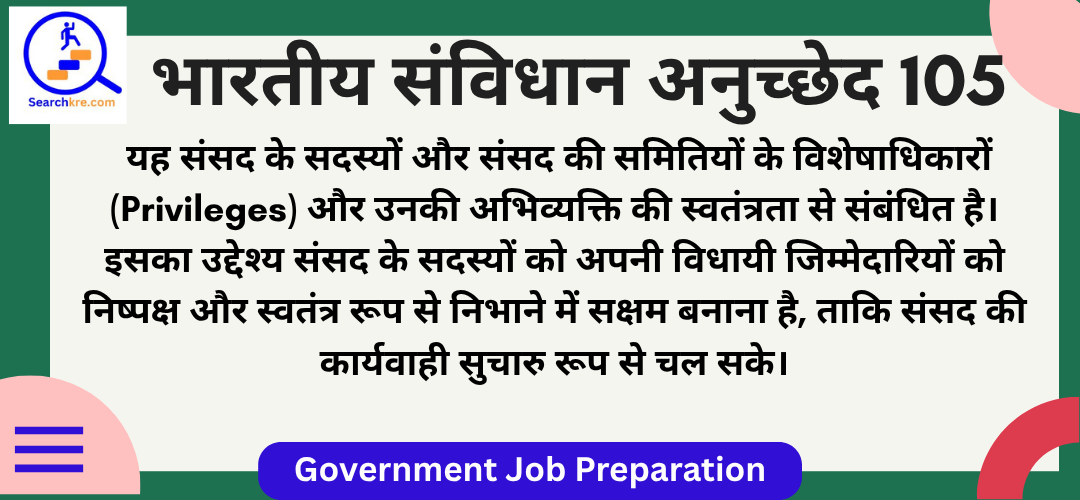 अनुच्छेद 105 का सार अनुच्छेद 105 भारतीय संविधान के भाग V (संघ) के अंतर्गत आता है। यह संसद के सदस्यों और संसद की समितियों के विशेषाधिकारों (Privileges) और उनकी अभिव्यक्ति की स्वतंत्रता से संबंधित है। इसका उद्देश्य संसद के सदस्यों को अपनी विधायी जिम्मेदारियों को निष्पक्ष और स्वतंत्र रूप से निभाने में सक्षम बनाना है, ताकि संसद की कार्यवाही सुचारु रूप से चल सके।