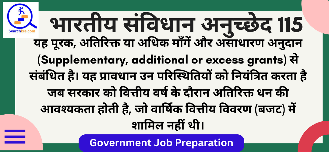 अनुच्छेद 115 भारतीय संविधान के भाग V (संघ) के अंतर्गत अध्याय II (संसद) में आता है। यह पूरक, अतिरिक्त या अधिक माँगें और असाधारण अनुदान (Supplementary, additional or excess grants) से संबंधित है। यह प्रावधान उन परिस्थितियों को नियंत्रित करता है जब सरकार को वित्तीय वर्ष के दौरान अतिरिक्त धन की आवश्यकता होती है, जो वार्षिक वित्तीय विवरण (बजट) में शामिल नहीं थी।