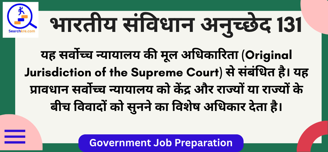 अनुच्छेद 131 भारतीय संविधान के भाग V (संघ) के अंतर्गत अध्याय IV (संघीय न्यायपालिका) में आता है। यह सर्वोच्च न्यायालय की मूल अधिकारिता (Original Jurisdiction of the Supreme Court) से संबंधित है। यह प्रावधान सर्वोच्च न्यायालय को केंद्र और राज्यों या राज्यों के बीच विवादों को सुनने का विशेष अधिकार देता है।