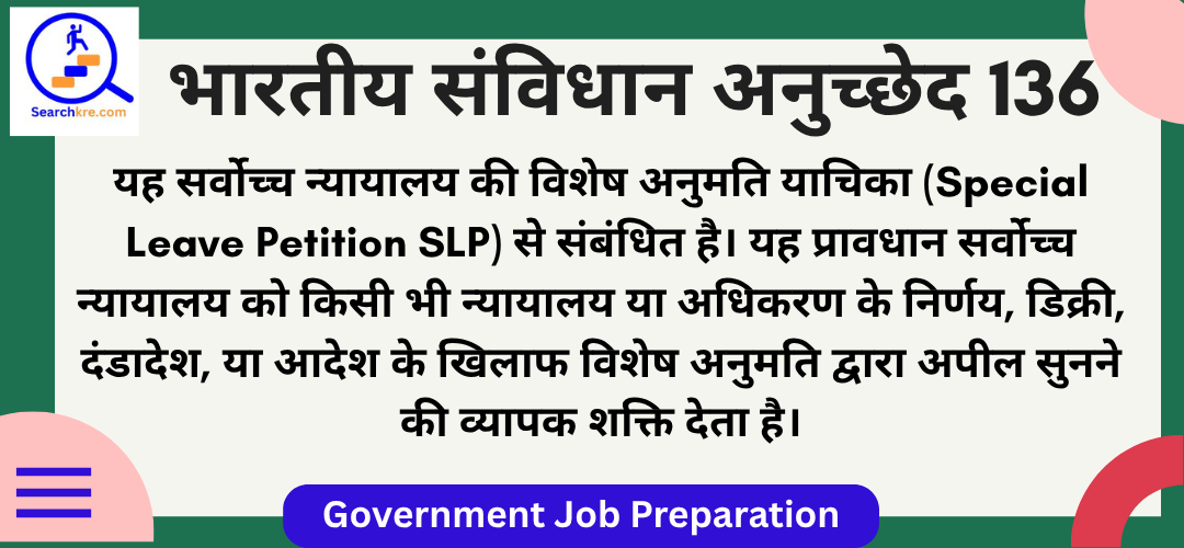 अनुच्छेद 136 भारतीय संविधान के भाग V (संघ) के अंतर्गत अध्याय IV (संघीय न्यायपालिका) में आता है। यह सर्वोच्च न्यायालय की विशेष अनुमति याचिका (Special Leave Petition SLP) से संबंधित है। यह प्रावधान सर्वोच्च न्यायालय को किसी भी न्यायालय या अधिकरण के निर्णय, डिक्री, दंडादेश, या आदेश के खिलाफ विशेष अनुमति द्वारा अपील सुनने की व्यापक शक्ति देता है।