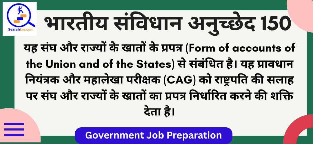 अनुच्छेद 150 भारतीय संविधान के भाग V (संघ) के अंतर्गत अध्याय V (नियंत्रक और महालेखा परीक्षक) में आता है। यह संघ और राज्यों के खातों के प्रपत्र (Form of accounts of the Union and of the States) से संबंधित है। यह प्रावधान नियंत्रक और महालेखा परीक्षक (CAG) को राष्ट्रपति की सलाह पर संघ और राज्यों के खातों का प्रपत्र निर्धारित करने की शक्ति देता है।