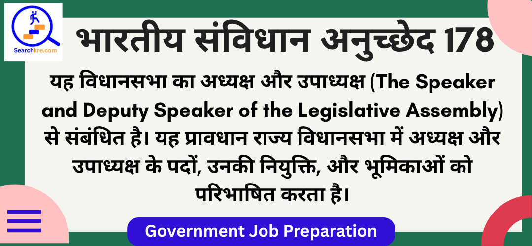 अनुच्छेद 178 भारतीय संविधान के भाग VI (राज्य) के अंतर्गत अध्याय III (राज्य का विधानमंडल) में आता है। यह विधानसभा का अध्यक्ष और उपाध्यक्ष (The Speaker and Deputy Speaker of the Legislative Assembly) से संबंधित है। यह प्रावधान राज्य विधानसभा में अध्यक्ष और उपाध्यक्ष के पदों, उनकी नियुक्ति, और भूमिकाओं को परिभाषित करता है।