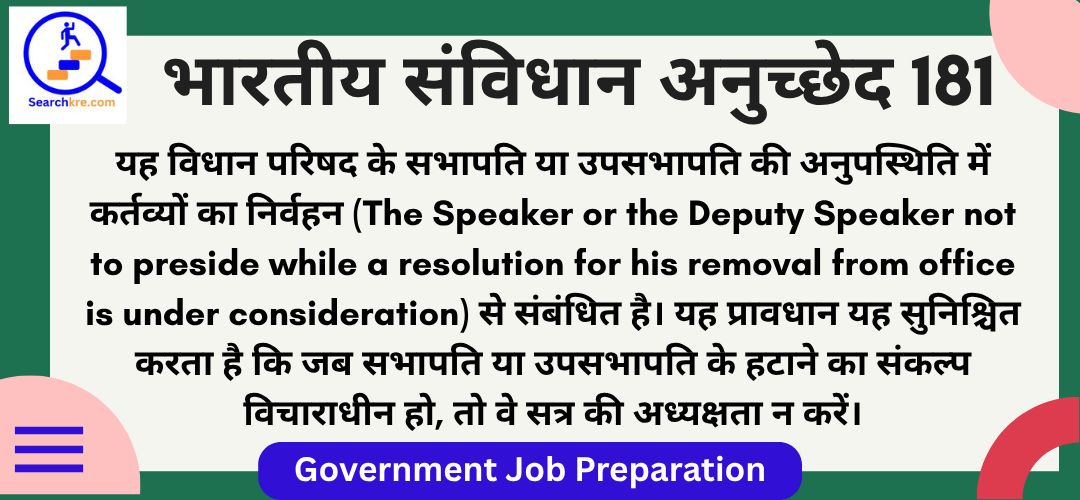 अनुच्छेद 181 भारतीय संविधान के भाग VI (राज्य) के अंतर्गत अध्याय III (राज्य का विधानमंडल) में आता है। यह विधान परिषद के सभापति या उपसभापति की अनुपस्थिति में कर्तव्यों का निर्वहन (The Speaker or the Deputy Speaker not to preside while a resolution for his removal from office is under consideration) से संबंधित है। यह प्रावधान यह सुनिश्चित करता है कि जब सभापति या उपसभापति के हटाने का संकल्प विचाराधीन हो, तो वे सत्र की अध्यक्षता न करें।