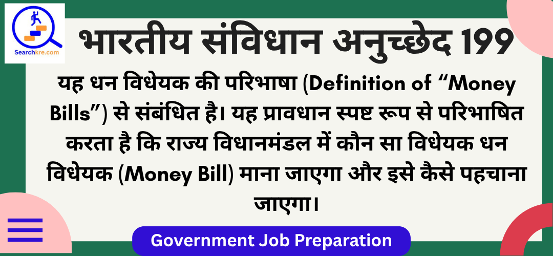 अनुच्छेद 199 भारतीय संविधान के भाग VI(राज्य) के अंतर्गत अध्याय III(राज्य का विधानमंडल) में आता है। यह धन विधेयक की परिभाषा(Definition of “Money Bills”) से संबंधित है। यह प्रावधान स्पष्ट रूप से परिभाषित करता है कि राज्य विधानमंडल में कौन सा विधेयक धन विधेयक(Money Bill) माना जाएगा और इसे कैसे पहचाना जाएगा।
