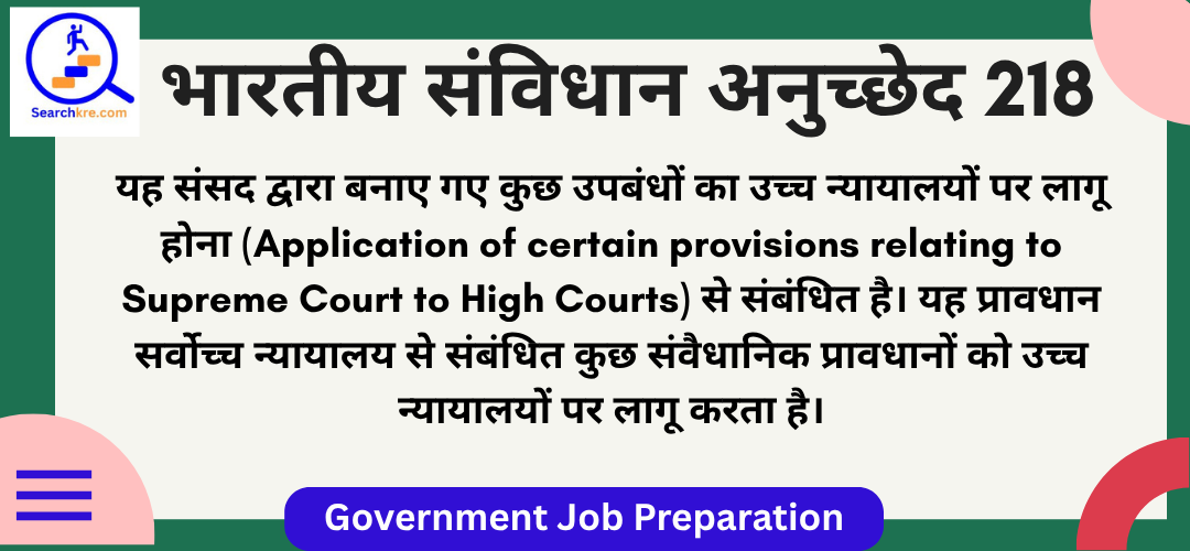 अनुच्छेद 218 भारतीय संविधान के भाग VI(राज्य) के अंतर्गत अध्याय V(राज्य में उच्च न्यायालय) में आता है। यह संसद द्वारा बनाए गए कुछ उपबंधों का उच्च न्यायालयों पर लागू होना(Application of certain provisions relating to Supreme Court to High Courts) से संबंधित है। यह प्रावधान सर्वोच्च न्यायालय से संबंधित कुछ संवैधानिक प्रावधानों को उच्च न्यायालयों पर लागू करता है।
