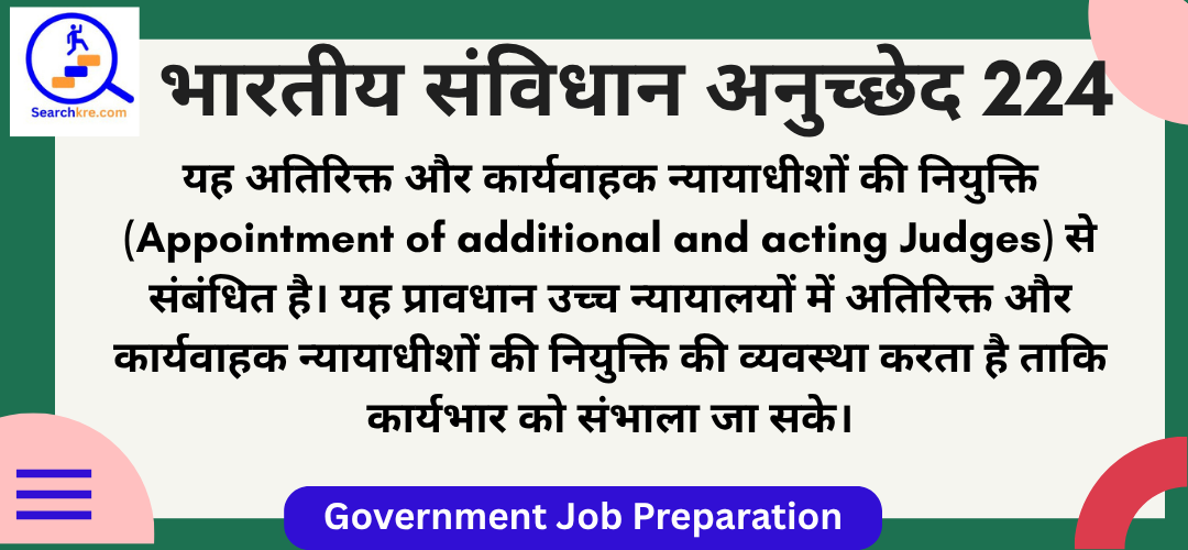 अनुच्छेद 224 भारतीय संविधान के भाग VI(राज्य) के अंतर्गत अध्याय V(राज्य में उच्च न्यायालय) में आता है। यह अतिरिक्त और कार्यवाहक न्यायाधीशों की नियुक्ति(Appointment of additional and acting Judges) से संबंधित है। यह प्रावधान उच्च न्यायालयों में अतिरिक्त और कार्यवाहक न्यायाधीशों की नियुक्ति की व्यवस्था करता है ताकि कार्यभार को संभाला जा सके।