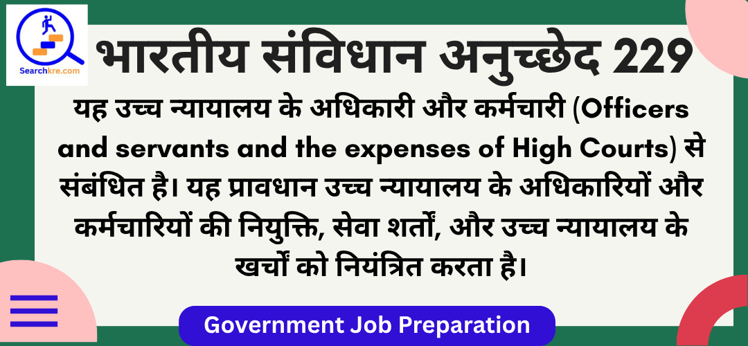 अनुच्छेद 229 भारतीय संविधान के भाग VI(राज्य) के अंतर्गत अध्याय V(राज्य में उच्च न्यायालय) में आता है। यह उच्च न्यायालय के अधिकारी और कर्मचारी(Officers and servants and the expenses of High Courts) से संबंधित है। यह प्रावधान उच्च न्यायालय के अधिकारियों और कर्मचारियों की नियुक्ति, सेवा शर्तों, और उच्च न्यायालय के खर्चों को नियंत्रित करता है।