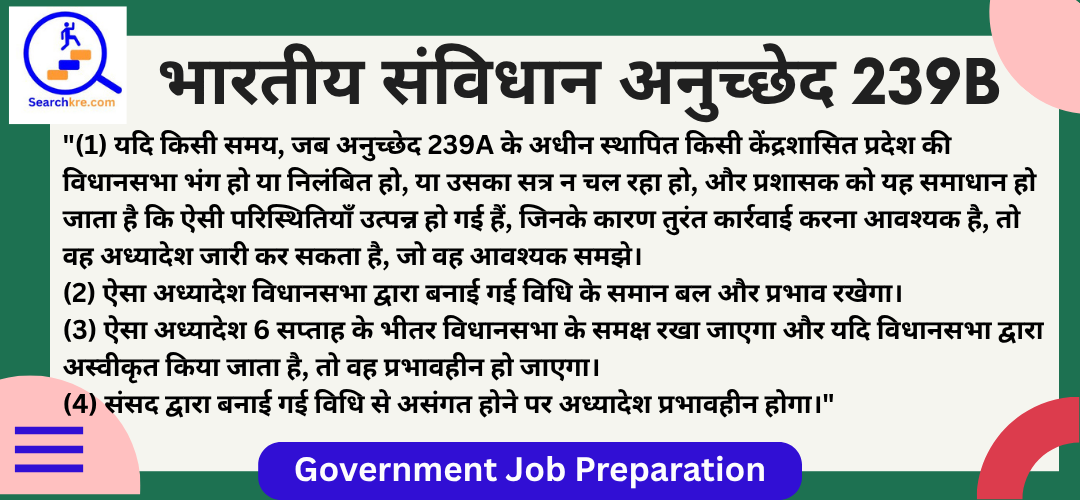 अनुच्छेद 239B भारतीय संविधान के भाग VIII(केंद्रशासित प्रदेश) में आता है। यह कुछ केंद्रशासित प्रदेशों में विधानसभा के निलंबन या भंग होने की स्थिति में अध्यादेश जारी करने की शक्ति(Power of administrator to promulgate Ordinances during recess of Legislature) से संबंधित है। यह प्रावधान कुछ केंद्रशासित प्रदेशों(जैसे, पुडुचेरी) के प्रशासक को विधानसभा के सत्र न होने पर अध्यादेश जारी करने की शक्ति देता है। यह अनुच्छेद 37वें संशोधन(1975) के द्वारा जोड़ा गया था।