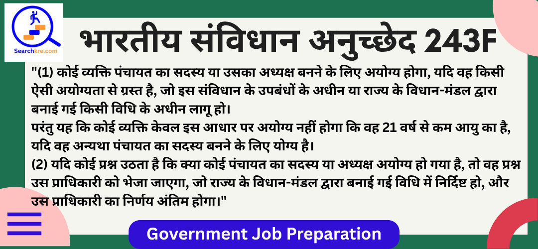 अनुच्छेद 243F भारतीय संविधान के भाग IX(पंचायत) में आता है। यह पंचायतों के सदस्यों और अध्यक्षों की अयोग्यता(Disqualifications for membership) से संबंधित है। यह प्रावधान पंचायतों के सदस्यों और अध्यक्षों की अयोग्यता के आधारों को निर्धारित करता है, ताकि पंचायती राज संस्थाओं में जवाबदेही और निष्पक्षता सुनिश्चित हो। यह अनुच्छेद 73वें संशोधन(1992) के द्वारा जोड़ा गया, जिसने पंचायती राज संस्थाओं को संवैधानिक दर्जा प्रदान किया।