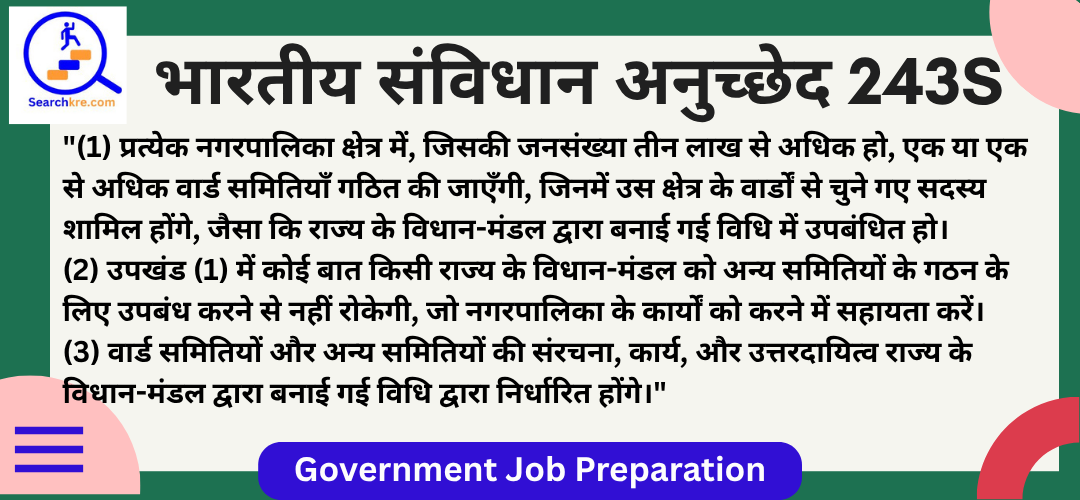 अनुच्छेद 243S भारतीय संविधान के भाग IX-A(नगरपालिकाएँ) में आता है। यह वार्ड समितियों और अन्य समितियों का गठन और संरचना(Constitution and composition of Wards Committees, etc.) से संबंधित है। यह प्रावधान नगरपालिकाओं में वार्ड समितियों और अन्य समितियों के गठन को नियंत्रित करता है ताकि शहरी शासन में स्थानीय स्तर पर प्रभावी भागीदारी सुनिश्चित हो। यह अनुच्छेद 74वें संशोधन(1992) के द्वारा जोड़ा गया, जिसने शहरी स्थानीय निकायों को संवैधानिक दर्जा प्रदान किया।