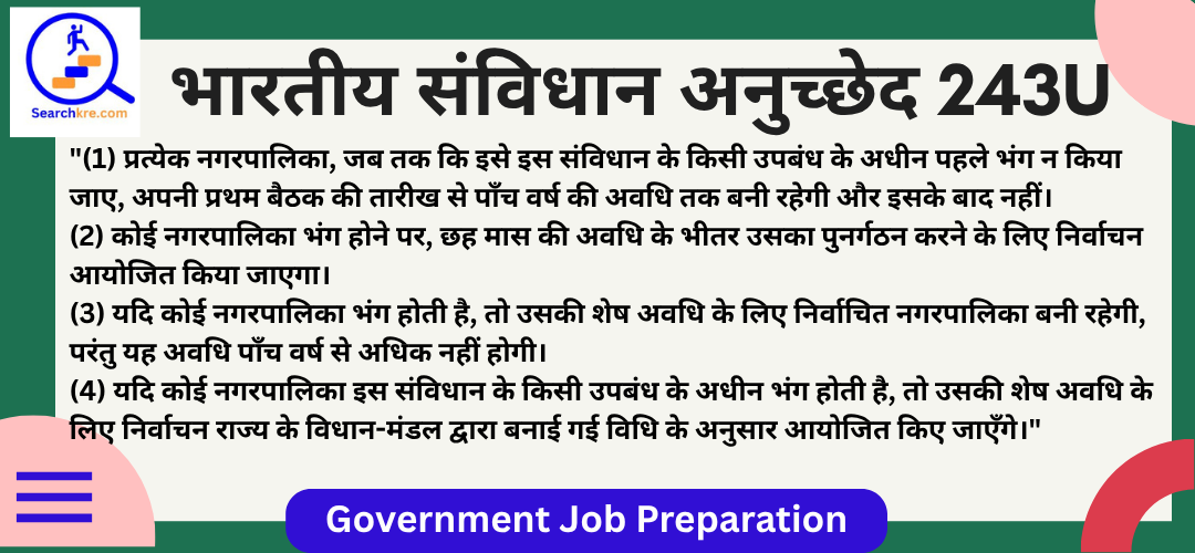 अनुच्छेद 243U भारतीय संविधान के भाग IX-A(नगरपालिकाएँ) में आता है। यह नगरपालिकाओं की अवधि(Duration of Municipalities, etc.) से संबंधित है। यह प्रावधान नगरपालिकाओं की अवधि, उनके भंग होने, और पुनर्गठन से संबंधित नियमों को नियंत्रित करता है ताकि शहरी स्थानीय शासन में निरंतरता और स्थिरता सुनिश्चित हो। यह अनुच्छेद 74वें संशोधन(1992) के द्वारा जोड़ा गया, जिसने शहरी स्थानीय निकायों को संवैधानिक दर्जा प्रदान किया।