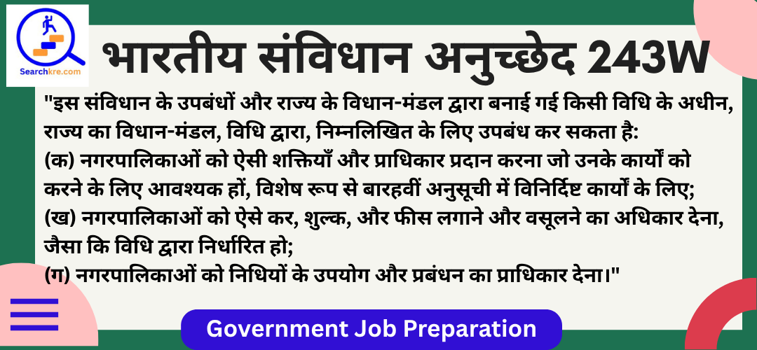 अनुच्छेद 243W भारतीय संविधान के भाग IX-A(नगरपालिकाएँ) में आता है। यह नगरपालिकाओं की शक्तियाँ, प्राधिकार, और उत्तरदायित्व(Powers, authority, and responsibilities of Municipalities, etc.) से संबंधित है। यह प्रावधान नगरपालिकाओं को शहरी शासन और विकास के लिए आवश्यक शक्तियाँ और कार्य सौंपता है। यह अनुच्छेद 74वें संशोधन(1992) के द्वारा जोड़ा गया, जिसने शहरी स्थानीय निकायों को संवैधानिक दर्जा प्रदान किया।