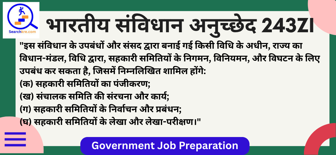 उद्देश्य: अनुच्छेद 243ZI राज्य विधानमंडल को सहकारी समितियों के निगमन(गठन), विनियमन(प्रबंधन), और विघटन(समापन) के लिए नियम बनाने का अधिकार देता है। यह सहकारी समितियों में लोकतांत्रिक प्रबंधन, पारदर्शिता, और जवाबदेही सुनिश्चित करता है। इसका लक्ष्य सहकारी आंदोलन को सशक्त करना, लोकतांत्रिक विकेंद्रीकरण को बढ़ावा देना, और संघीय ढांचे में सहकारी समितियों की स्वायत्तता को संरक्षित करना है।