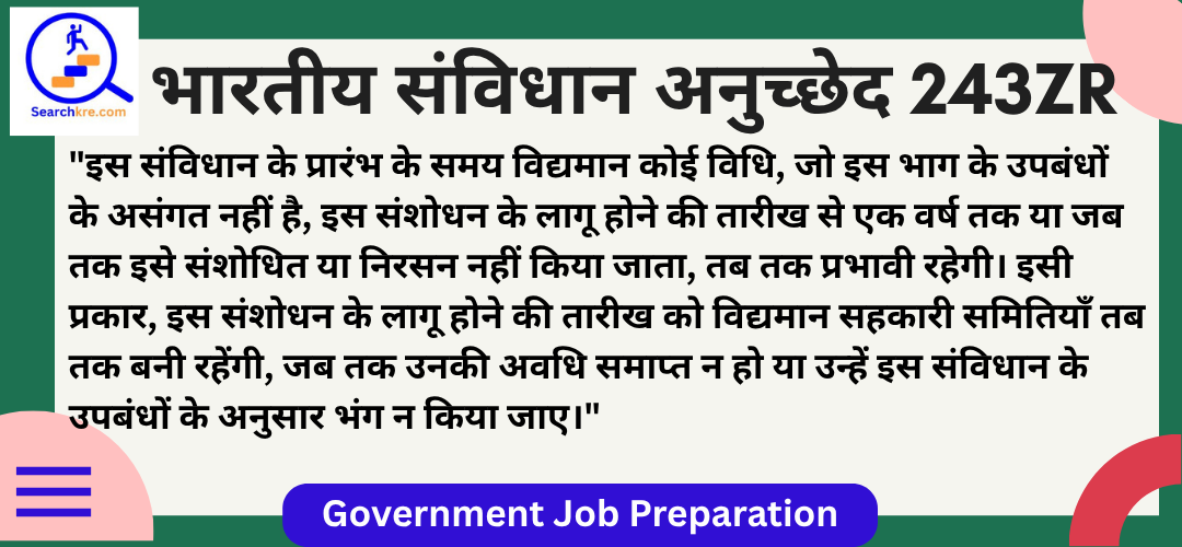 अनुच्छेद 243ZR भारतीय संविधान के भाग IX-B(सहकारी समितियाँ) में आता है। यह वर्तमान विधियों और सहकारी समितियों का बने रहना(Continuance of existing laws and cooperative societies) से संबंधित है। यह प्रावधान यह सुनिश्चित करता है कि 97वें संशोधन(2011) के लागू होने के बाद भी मौजूदा विधियाँ और सहकारी समितियाँ कुछ शर्तों के साथ बनी रहें। यह अनुच्छेद 97वें संशोधन(2011) के द्वारा जोड़ा गया, जिसने सहकारी समितियों को संवैधानिक दर्जा प्रदान किया।