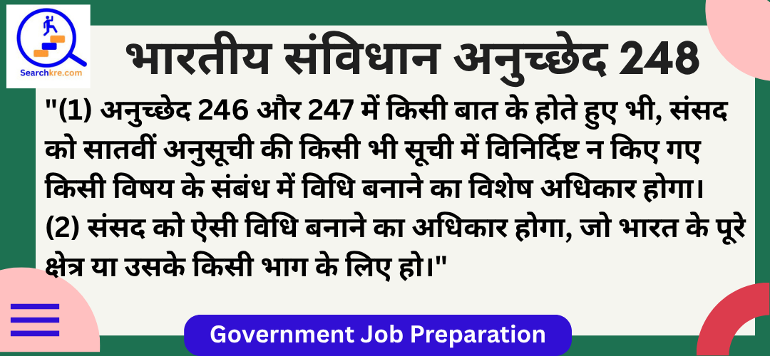 अनुच्छेद 248 भारतीय संविधान के भाग XI(केंद्र और राज्यों के बीच विधायी संबंध) में आता है। यह संसद की अवशिष्ट विधायी शक्तियों(Residuary powers of legislation) से संबंधित है। यह प्रावधान संसद को उन विषयों पर विधि बनाने का अधिकार देता है जो सातवीं अनुसूची की किसी भी सूची(संघ, राज्य, या समवर्ती सूची) में शामिल नहीं हैं। यह केंद्र की विधायी प्रभुता को सुदृढ़ करता है और भारत के संघीय ढांचे में केंद्र को प्रबल स्थिति प्रदान करता है।