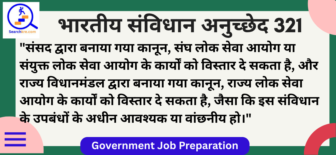 अनुच्छेद 321 भारतीय संविधान के भाग XIV (संघ और राज्यों के अधीन सेवाएँ) में आता है। यह लोक सेवा आयोगों के कार्यों का विस्तार करने की शक्ति (Power to extend functions of Public Service Commissions) से संबंधित है। यह प्रावधान संसद या राज्य विधानमंडल को संघ लोक सेवा आयोग (UPSC) और राज्य लोक सेवा आयोग (SPSC) के कार्यों को विस्तार देने की शक्ति देता है, ताकि वे अतिरिक्त जिम्मेदारियाँ संभाल सकें।