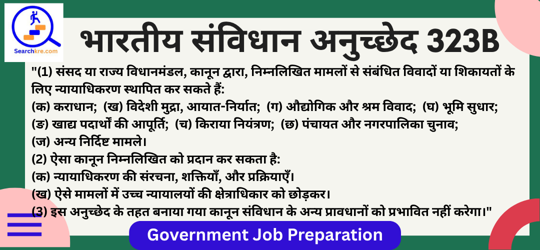 अनुच्छेद 323B भारतीय संविधान के भाग XIV-A (न्यायाधिकरण) में आता है। यह विशिष्ट मामलों के लिए न्यायाधिकरण (Tribunals for other matters) की स्थापना से संबंधित है। यह प्रावधान संसद और राज्य विधानमंडल को विभिन्न विशिष्ट क्षेत्रों (जैसे कर, श्रम, पर्यावरण आदि) से संबंधित विवादों के लिए न्यायाधिकरण स्थापित करने की शक्ति देता है।