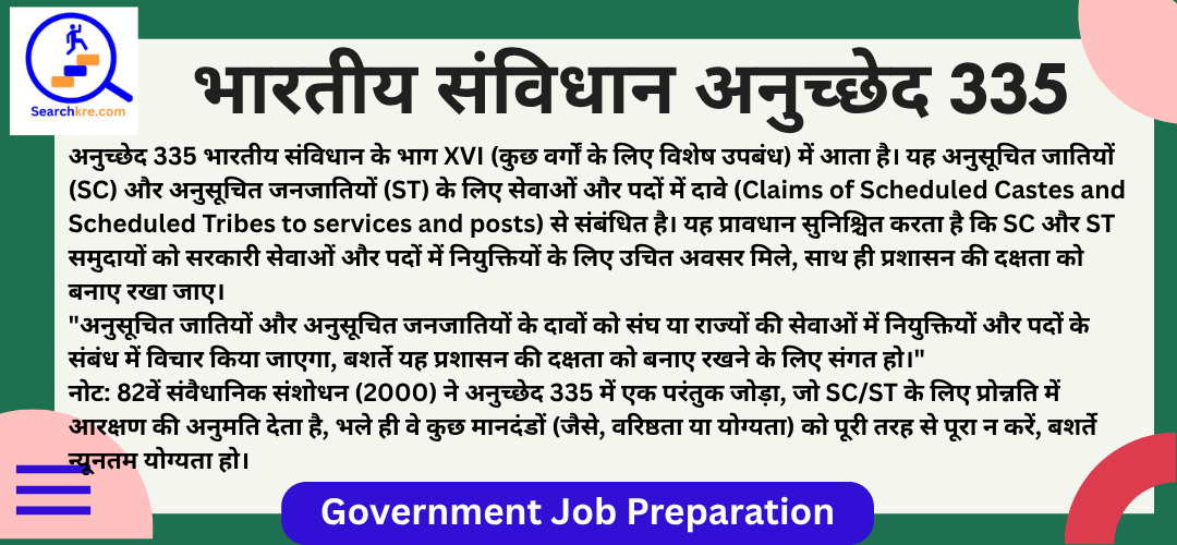 अनुच्छेद 335 भारतीय संविधान के भाग XVI (कुछ वर्गों के लिए विशेष उपबंध) में आता है। यह अनुसूचित जातियों (SC) और अनुसूचित जनजातियों (ST) के लिए सेवाओं और पदों में दावे (Claims of Scheduled Castes and Scheduled Tribes to services and posts) से संबंधित है। यह प्रावधान सुनिश्चित करता है कि SC और ST समुदायों को सरकारी सेवाओं और पदों में नियुक्तियों के लिए उचित अवसर मिले, साथ ही प्रशासन की दक्षता को बनाए रखा जाए।