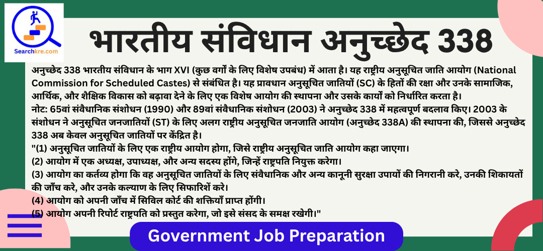 अनुच्छेद 338 भारतीय संविधान के भाग XVI (कुछ वर्गों के लिए विशेष उपबंध) में आता है। यह राष्ट्रीय अनुसूचित जाति आयोग (National Commission for Scheduled Castes) से संबंधित है। यह प्रावधान अनुसूचित जातियों (SC) के हितों की रक्षा और उनके सामाजिक, आर्थिक, और शैक्षिक विकास को बढ़ावा देने के लिए एक विशेष आयोग की स्थापना और उसके कार्यों को निर्धारित करता है।