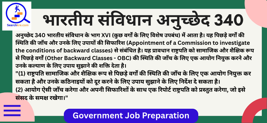 अनुच्छेद 340 भारतीय संविधान के भाग XVI (कुछ वर्गों के लिए विशेष उपबंध) में आता है। यह पिछड़े वर्गों की स्थिति की जाँच और उनके लिए उपायों की सिफारिश (Appointment of a Commission to investigate the conditions of backward classes) से संबंधित है। यह प्रावधान राष्ट्रपति को सामाजिक और शैक्षिक रूप से पिछड़े वर्गों (Other Backward Classes - OBC) की स्थिति की जाँच के लिए एक आयोग नियुक्त करने और उनके कल्याण के लिए उपाय सुझाने की शक्ति देता है।