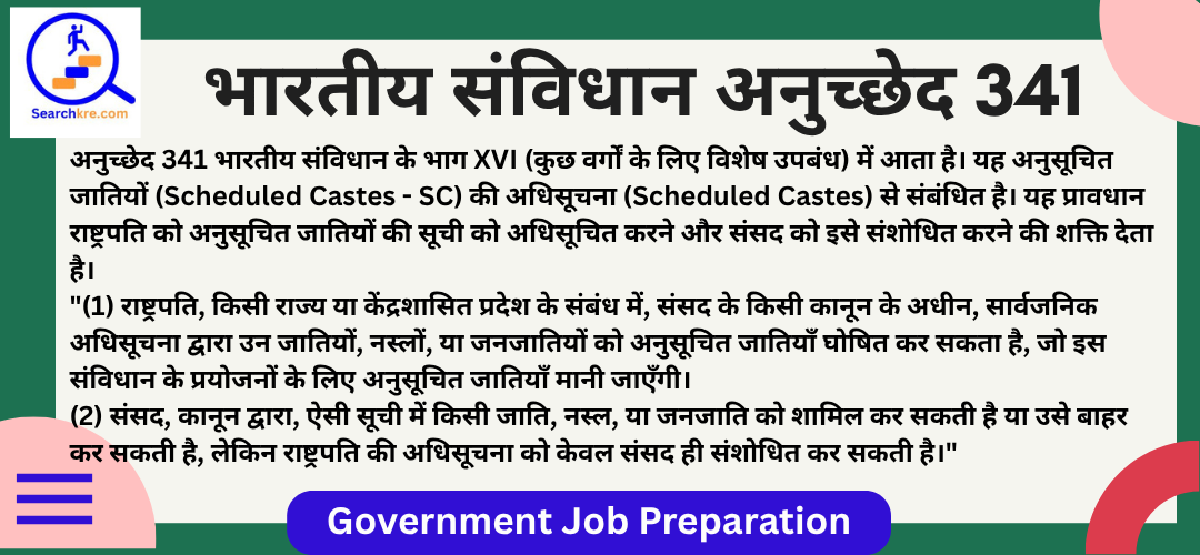 अनुच्छेद 341 भारतीय संविधान के भाग XVI (कुछ वर्गों के लिए विशेष उपबंध) में आता है। यह अनुसूचित जातियों (Scheduled Castes - SC) की अधिसूचना (Scheduled Castes) से संबंधित है। यह प्रावधान राष्ट्रपति को अनुसूचित जातियों की सूची को अधिसूचित करने और संसद को इसे संशोधित करने की शक्ति देता है।