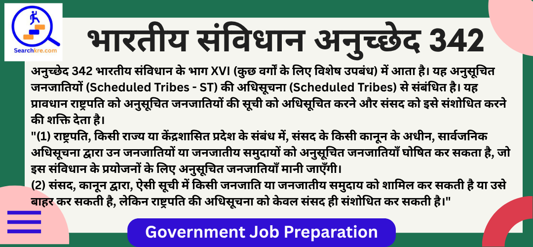 अनुच्छेद 342 भारतीय संविधान के भाग XVI (कुछ वर्गों के लिए विशेष उपबंध) में आता है। यह अनुसूचित जनजातियों (Scheduled Tribes - ST) की अधिसूचना (Scheduled Tribes) से संबंधित है। यह प्रावधान राष्ट्रपति को अनुसूचित जनजातियों की सूची को अधिसूचित करने और संसद को इसे संशोधित करने की शक्ति देता है।