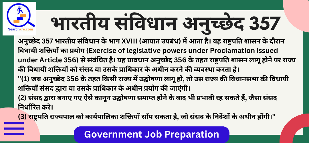 अनुच्छेद 357 भारतीय संविधान के भाग XVIII (आपात उपबंध) में आता है। यह राष्ट्रपति शासन के दौरान विधायी शक्तियों का प्रयोग (Exercise of legislative powers under Proclamation issued under Article 356) से संबंधित है। यह प्रावधान अनुच्छेद 356 के तहत राष्ट्रपति शासन लागू होने पर राज्य की विधायी शक्तियों को संसद या उसके प्राधिकार के अधीन करने की व्यवस्था करता है।