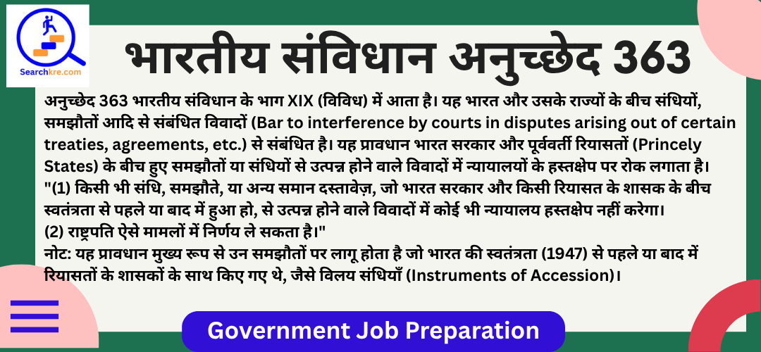 अनुच्छेद 363 भारतीय संविधान के भाग XIX (विविध) में आता है। यह भारत और उसके राज्यों के बीच संधियों, समझौतों आदि से संबंधित विवादों (Bar to interference by courts in disputes arising out of certain treaties, agreements, etc.) से संबंधित है। यह प्रावधान भारत सरकार और पूर्ववर्ती रियासतों (Princely States) के बीच हुए समझौतों या संधियों से उत्पन्न होने वाले विवादों में न्यायालयों के हस्तक्षेप पर रोक लगाता है।