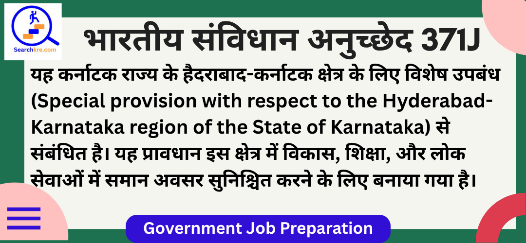 अनुच्छेद 371J भारतीय संविधान के भाग XXI (अस्थायी, संक्रमणकालीन और विशेष उपबंध) में आता है। यह कर्नाटक राज्य के हैदराबाद-कर्नाटक क्षेत्र के लिए विशेष उपबंध (Special provision with respect to the Hyderabad-Karnataka region of the State of Karnataka) से संबंधित है। यह प्रावधान इस क्षेत्र में विकास, शिक्षा, और लोक सेवाओं में समान अवसर सुनिश्चित करने के लिए बनाया गया है।