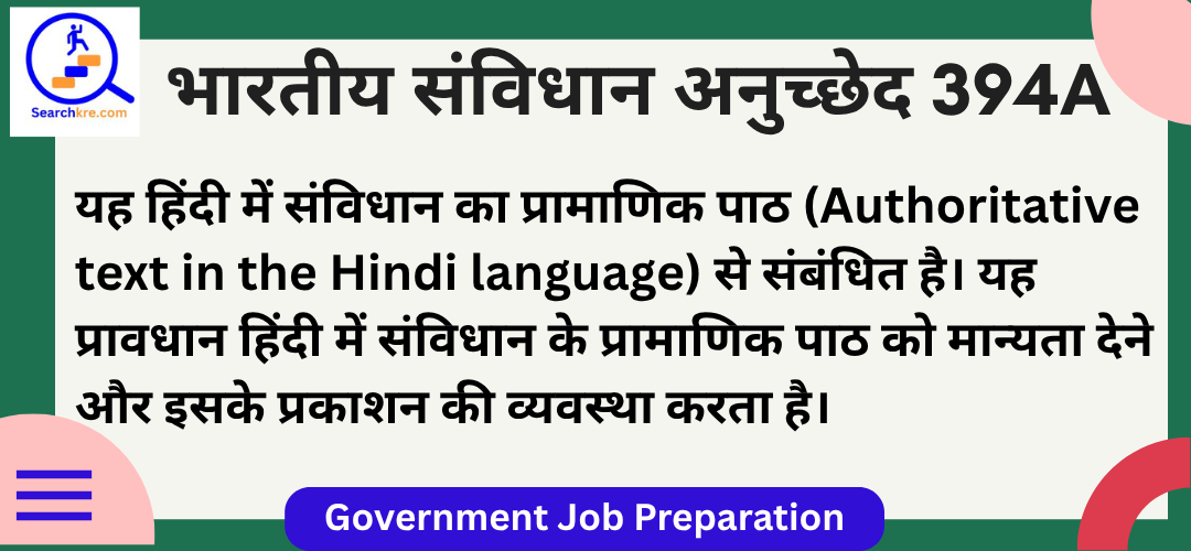 उद्देश्य: अनुच्छेद 394A का उद्देश्य हिंदी में संविधान के प्रामाणिक पाठ को आधिकारिक मान्यता देना और इसे कानूनी बल प्रदान करना है। यह हिंदी को राष्ट्रीय भाषा के रूप में बढ़ावा देने और संवैधानिक कार्यवाहियों में इसके उपयोग को सुनिश्चित करता है। इसका लक्ष्य भाषाई समावेश, संवैधानिक पहुंच, और राष्ट्रीय एकता को बढ़ावा देना है।