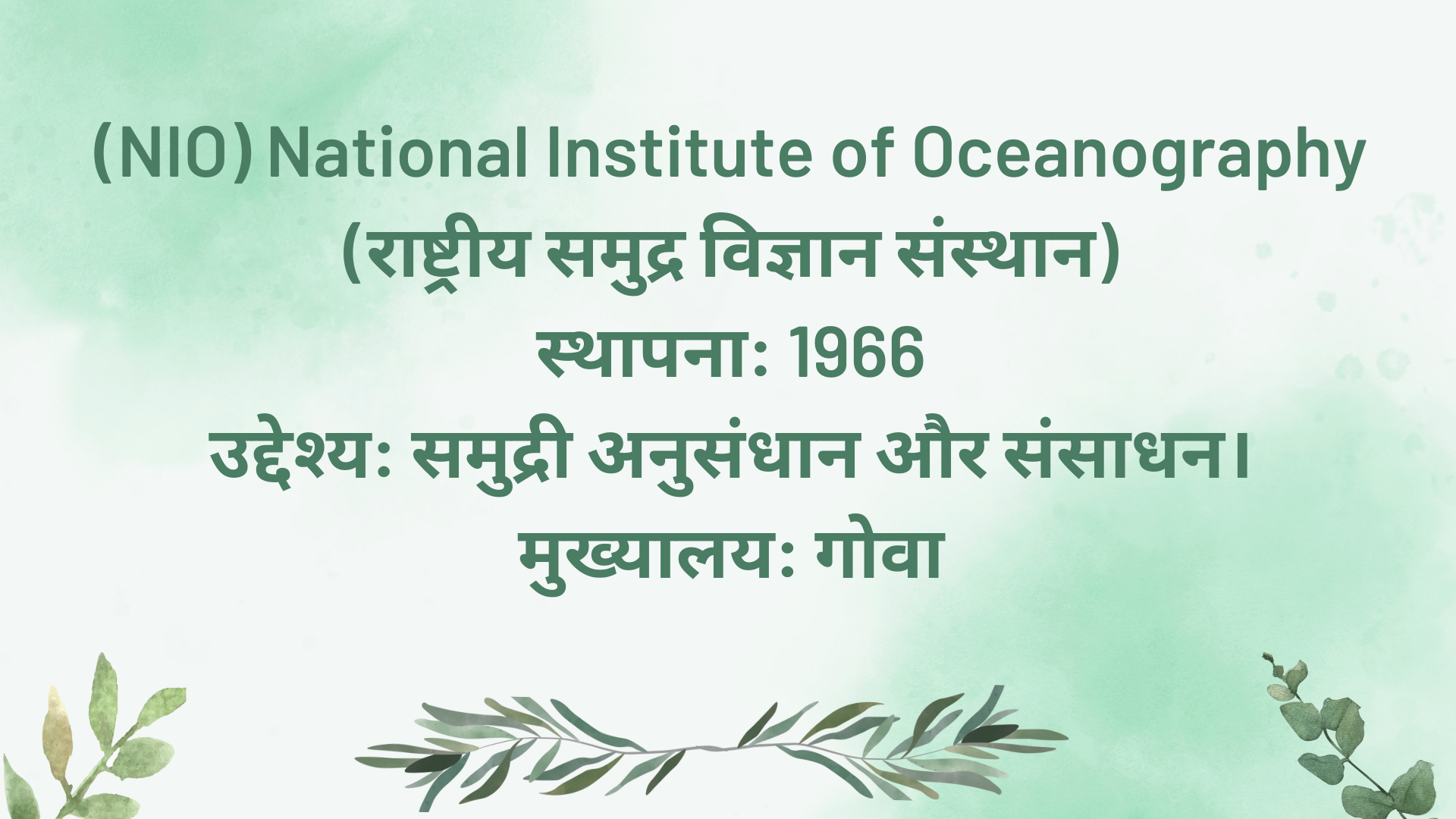 स्थापना: 1966 उद्देश्य: समुद्री अनुसंधान और संसाधन। मुख्यालय: गोवा