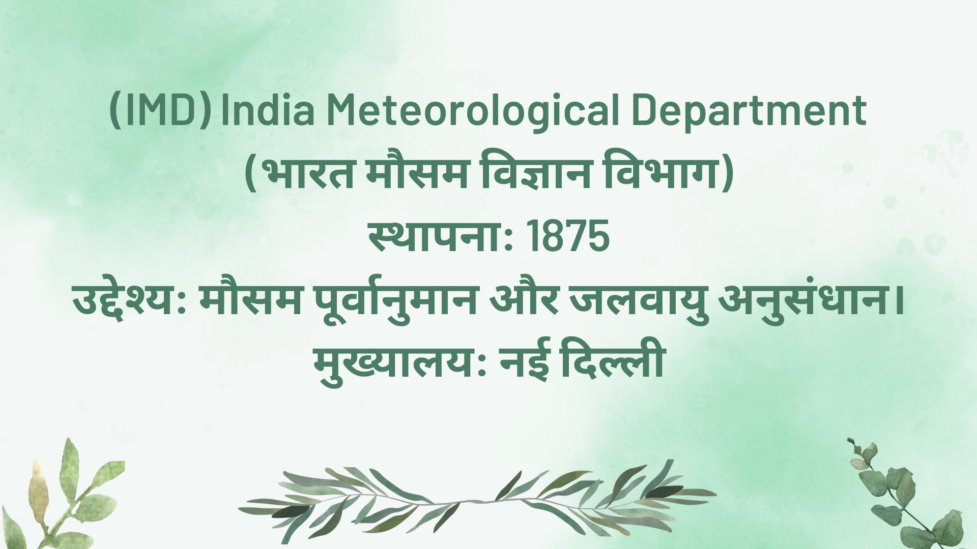 स्थापना: 1875 उद्देश्य: मौसम पूर्वानुमान और जलवायु अनुसंधान। मुख्यालय: नई दिल्ली