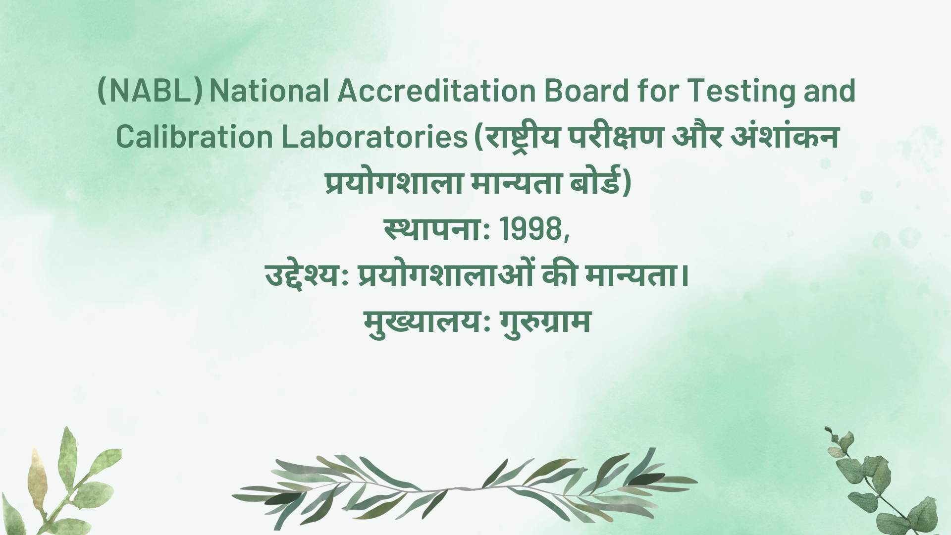 (NABL) National Accreditation Board for Testing and Calibration Laboratories (राष्ट्रीय परीक्षण और अंशांकन प्रयोगशाला मान्यता बोर्ड)