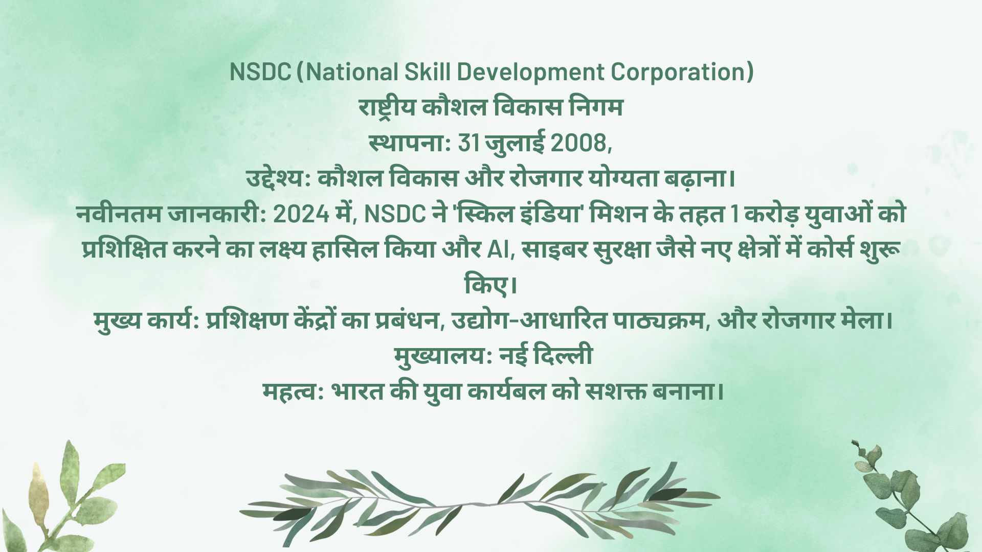 नवीनतम जानकारी: 2024 में, NSDC ने 'स्किल इंडिया' मिशन के तहत 1 करोड़ युवाओं को प्रशिक्षित करने का लक्ष्य हासिल किया और AI, साइबर सुरक्षा जैसे नए क्षेत्रों में कोर्स शुरू किए।
