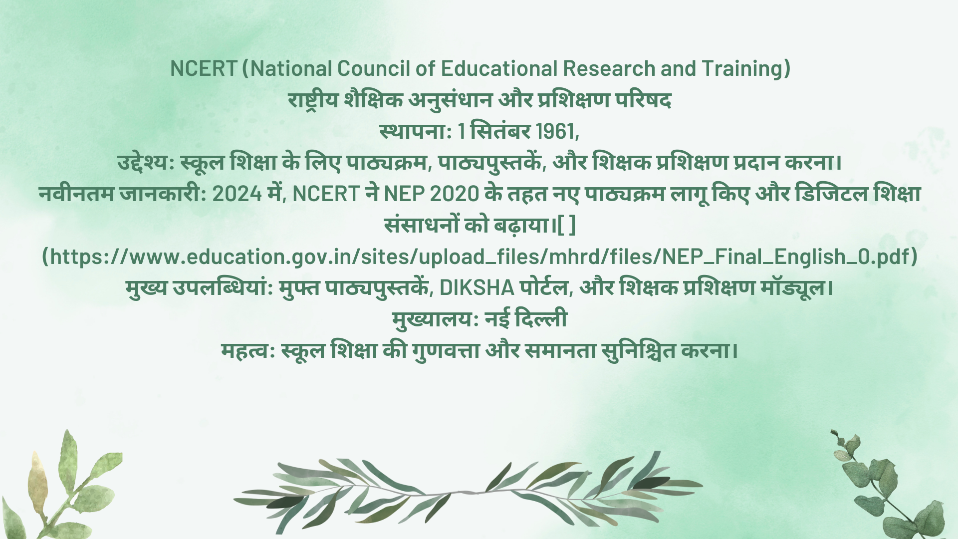 नवीनतम जानकारी: 2024 में, NCERT ने NEP 2020 के तहत नए पाठ्यक्रम लागू किए और डिजिटल शिक्षा संसाधनों को बढ़ाया।