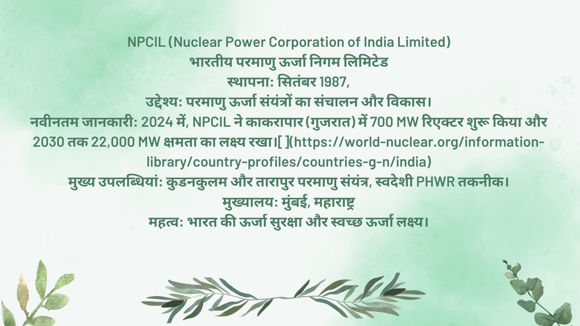नवीनतम जानकारी: 2024 में, NPCIL ने काकरापार (गुजरात) में 700 MW रिएक्टर शुरू किया और 2030 तक 22,000 MW क्षमता का लक्ष्य रखा।