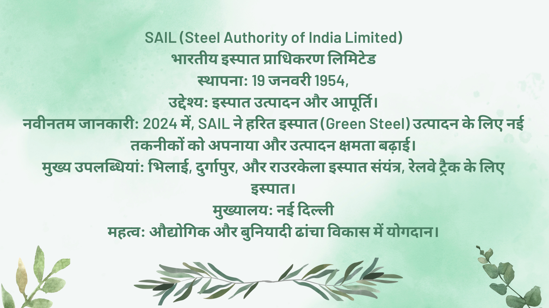 नवीनतम जानकारी: 2024 में, SAIL ने हरित इस्पात (Green Steel) उत्पादन के लिए नई तकनीकों को अपनाया और उत्पादन क्षमता बढ़ाई।