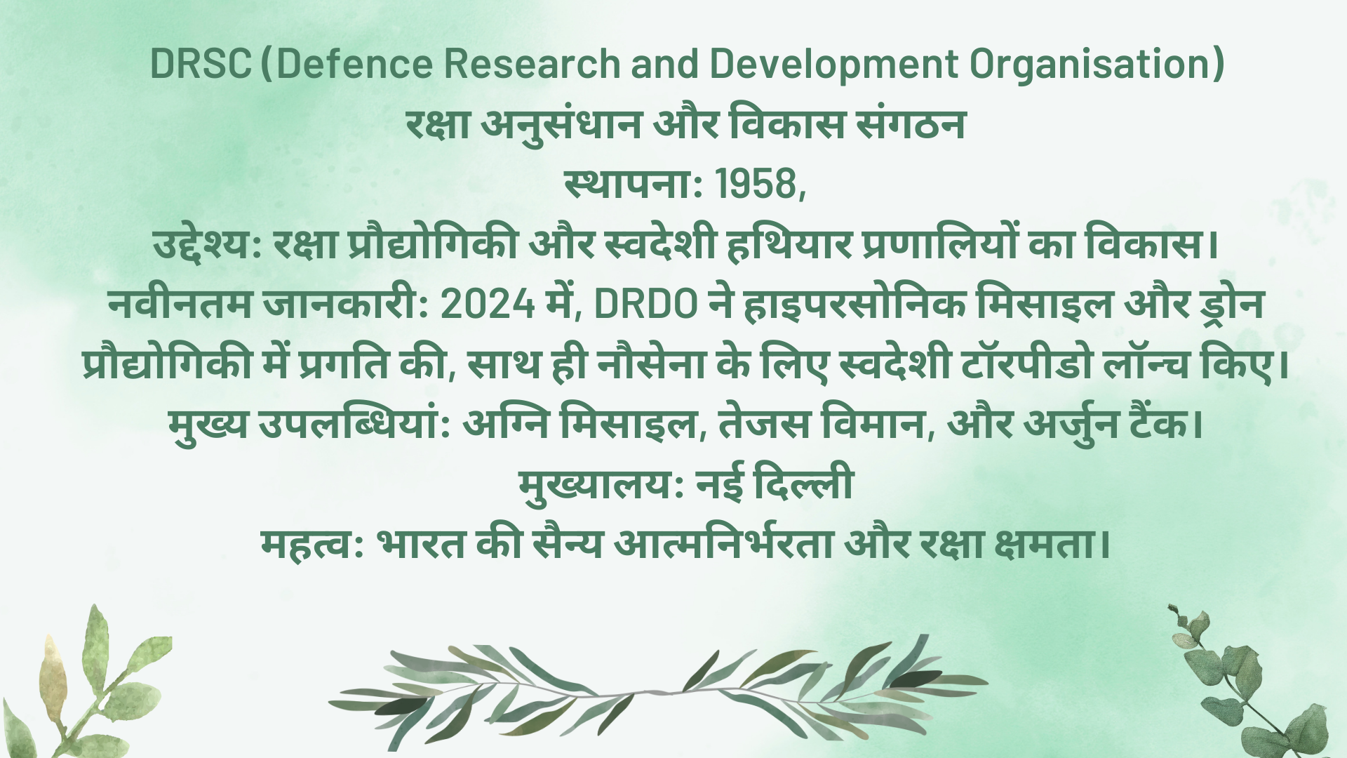 नवीनतम जानकारी: 2024 में, DRDO ने हाइपरसोनिक मिसाइल और ड्रोन प्रौद्योगिकी में प्रगति की, साथ ही नौसेना के लिए स्वदेशी टॉरपीडो लॉन्च किए।