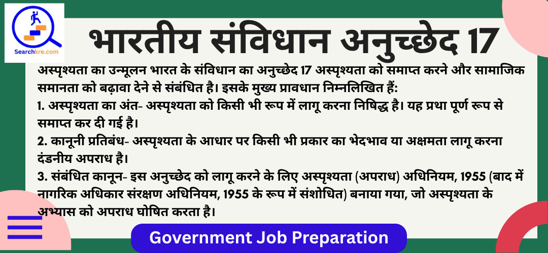 भारतीय संविधान का अनुच्छेद 17: अस्पृश्यता का उन्मूलन भारत के संविधान का अनुच्छेद 17 अस्पृश्यता को समाप्त करने और सामाजिक समानता को बढ़ावा देने से संबंधित है। इसके मुख्य प्रावधान निम्नलिखित हैं: