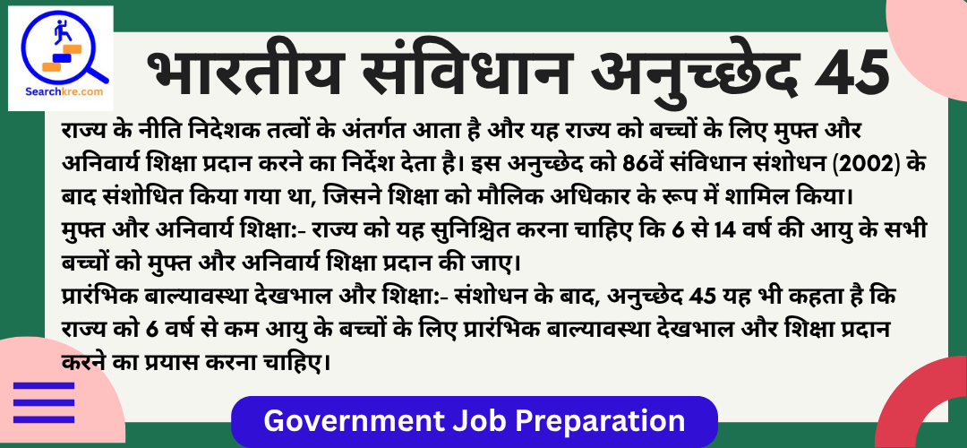 भारतीय संविधान का अनुच्छेद 45 राज्य के नीति निदेशक तत्वों के अंतर्गत आता है और यह राज्य को बच्चों के लिए मुफ्त और अनिवार्य शिक्षा प्रदान करने का निर्देश देता है। इस अनुच्छेद को 86वें संविधान संशोधन (2002) के बाद संशोधित किया गया था, जिसने शिक्षा को मौलिक अधिकार के रूप में शामिल किया।