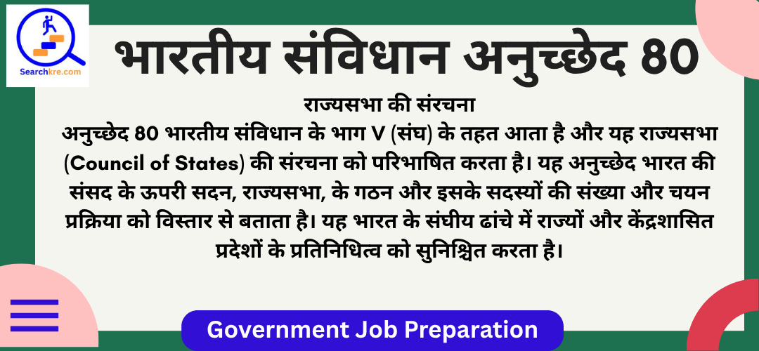 अनुच्छेद 80 भारतीय संविधान के भाग V (संघ) के तहत आता है और यह राज्यसभा (Council of States) की संरचना को परिभाषित करता है। यह अनुच्छेद भारत की संसद के ऊपरी सदन, राज्यसभा, के गठन और इसके सदस्यों की संख्या और चयन प्रक्रिया को विस्तार से बताता है। यह भारत के संघीय ढांचे में राज्यों और केंद्रशासित प्रदेशों के प्रतिनिधित्व को सुनिश्चित करता है।