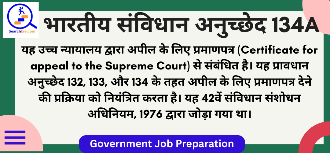 अनुच्छेद 134A भारतीय संविधान के भाग V (संघ) के अंतर्गत अध्याय IV (संघीय न्यायपालिका) में आता है। यह उच्च न्यायालय द्वारा अपील के लिए प्रमाणपत्र (Certificate for appeal to the Supreme Court) से संबंधित है। यह प्रावधान अनुच्छेद 132, 133, और 134 के तहत अपील के लिए प्रमाणपत्र देने की प्रक्रिया को नियंत्रित करता है। यह 42वें संविधान संशोधन अधिनियम, 1976 द्वारा जोड़ा गया था।