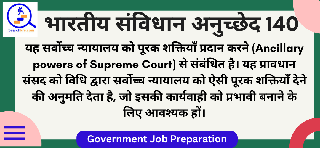 अनुच्छेद 140 भारतीय संविधान के भाग V (संघ) के अंतर्गत अध्याय IV (संघीय न्यायपालिका) में आता है। यह सर्वोच्च न्यायालय को पूरक शक्तियाँ प्रदान करने (Ancillary powers of Supreme Court) से संबंधित है। यह प्रावधान संसद को विधि द्वारा सर्वोच्च न्यायालय को ऐसी पूरक शक्तियाँ देने की अनुमति देता है, जो इसकी कार्यवाही को प्रभावी बनाने के लिए आवश्यक हों।