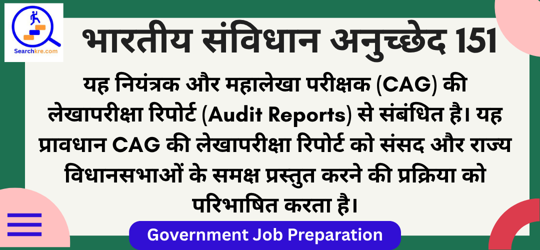 अनुच्छेद 151 भारतीय संविधान के भाग V (संघ) के अंतर्गत अध्याय V (नियंत्रक और महालेखा परीक्षक) में आता है। यह नियंत्रक और महालेखा परीक्षक (CAG) की लेखापरीक्षा रिपोर्ट (Audit Reports) से संबंधित है। यह प्रावधान CAG की लेखापरीक्षा रिपोर्ट को संसद और राज्य विधानसभाओं के समक्ष प्रस्तुत करने की प्रक्रिया को परिभाषित करता है।
