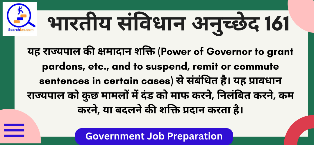 अनुच्छेद 161 भारतीय संविधान के भाग VI (राज्य) के अंतर्गत अध्याय II (कार्यपालिका) में आता है। यह राज्यपाल की क्षमादान शक्ति (Power of Governor to grant pardons, etc., and to suspend, remit or commute sentences in certain cases) से संबंधित है। यह प्रावधान राज्यपाल को कुछ मामलों में दंड को माफ करने, निलंबित करने, कम करने, या बदलने की शक्ति प्रदान करता है।