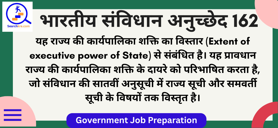 अनुच्छेद 162 भारतीय संविधान के भाग VI (राज्य) के अंतर्गत अध्याय II (कार्यपालिका) में आता है। यह राज्य की कार्यपालिका शक्ति का विस्तार (Extent of executive power of State) से संबंधित है। यह प्रावधान राज्य की कार्यपालिका शक्ति के दायरे को परिभाषित करता है, जो संविधान की सातवीं अनुसूची में राज्य सूची और समवर्ती सूची के विषयों तक विस्तृत है।